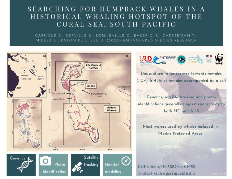 Claire Garrigue, Solène Derville, Claire Bonneville, C.Scott Baker, Ted Cheesemen, Laurent Millet, Dave Paton, Debbie Steel. 2020. Searching for humpback whales in a historical whaling hotspot of the Coral Sea, South Pacific. Endangered Species Research. 42: 67-82